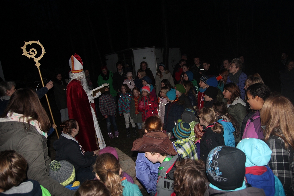 Kaum war das Theater vorbei, da war auch schon Glockenläuten zu hören. Der Nikolaus besuchte uns und beschenkte alle Kinder und auch sogar die Leiter, da alle in diesem Jahr sehr brav gewesen sind. Traditionell folgte die Versteigerung der über das Jahr vergessenen Fundsachen bei der fleißig mitgeboten wurde. Zum Abschluss gab es noch Aufnahmen in die Wölflingsstufe als auch einige Stufenwechsel.